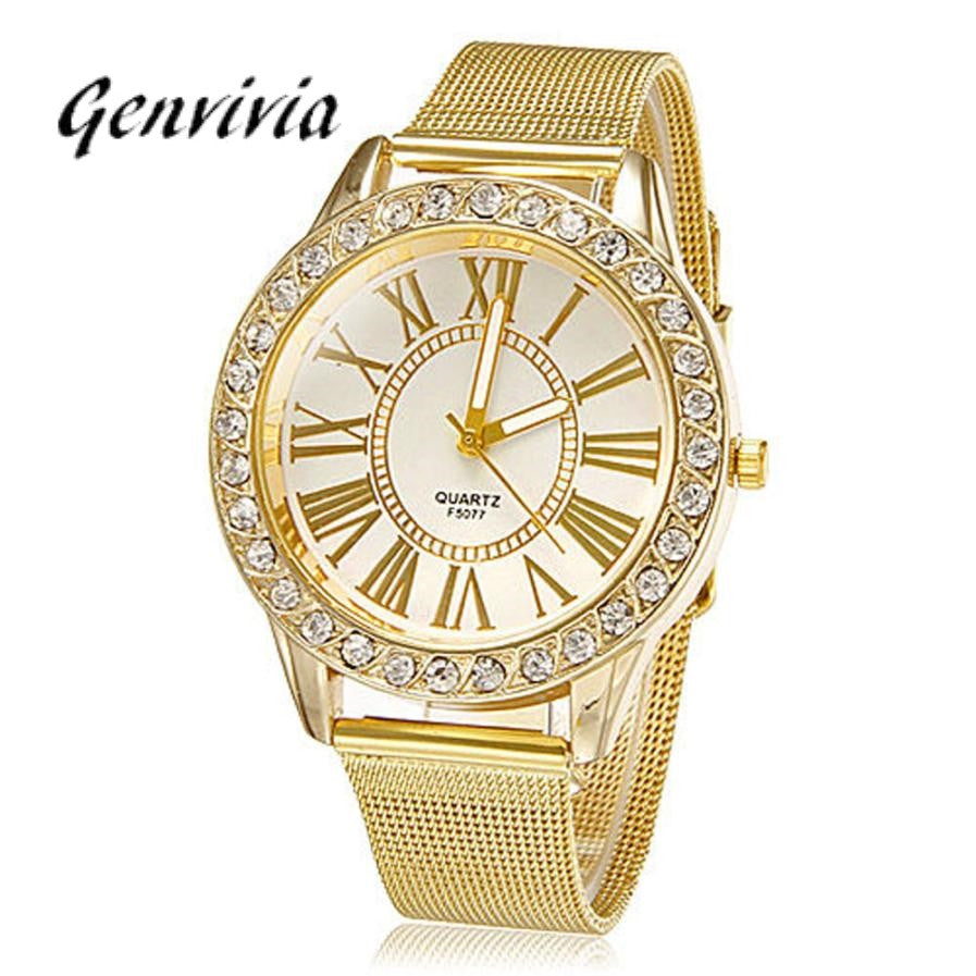 GENVIVIA Gold Stainless Steel Band Crystal Wrist Watch