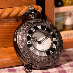 This Classic Black Pocket Watch is a rich design that many would appreciate. Crafted with an intricate design and a bold numeral dial on the watch face, and roman numerals delicately engraved in the front cover.