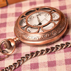 This Keepsake Pocket Watch is especially designed with authenticity that every collector craves and appreciates. It is detailed with a beautiful vintage inspired hunter design in a gentle rose gold or silver color.  The antique finish cover adds sophistication, allowing you to glance through to the inner gears of the time piece.